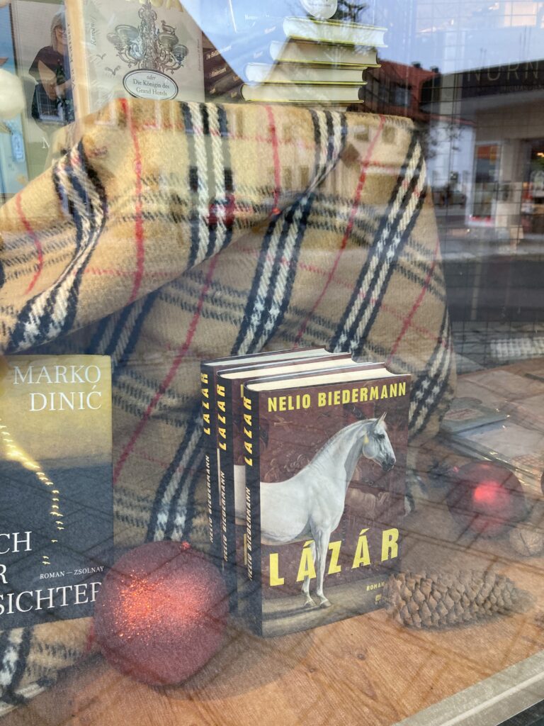 Sétànk soràn a fô utcàn egy kedves könyvesboltra akadtunk, s mit làttunk a kirakatban? Bizony a svàjci fiatalaember 2024-ben megjelent , délmagyarorszàgi arisztokrata csalàdròl írt történetét. Ki olvasta màr? Nelio Biedermann: Lázár